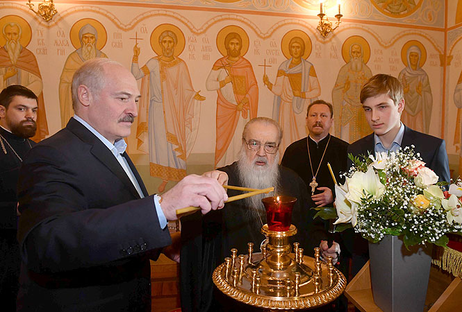 Александр Лукашенко, митрополит Филарет и Николай Лукашенко зажигают свечи, 8 апреля 2018 года. Фото: пресс-служба президента Беларуси