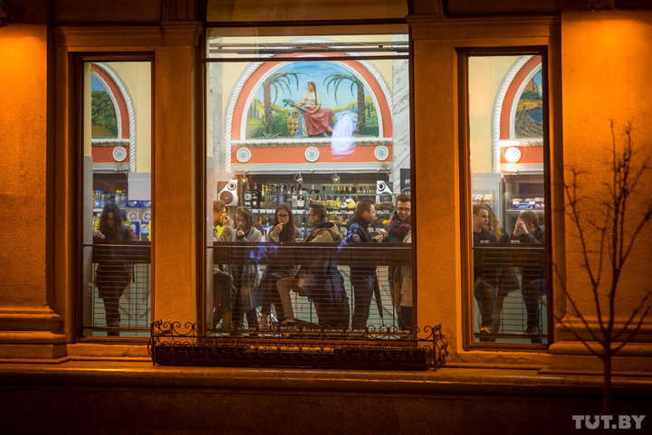 Люди за барной стойкой в кафетерии универсама «Центральный». Окна выходят на главную улицу Минска — проспект Независимости. Фото: Евгений Ерчак, TUT.BY