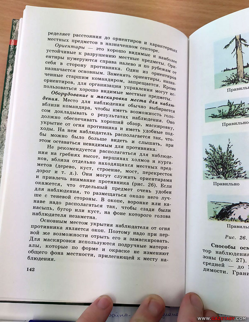 — Открываю учебник «Допризывная подготовка» некоего В.Б. Варламова и вижу картинку, на которой показано, как правильно выслеживать противника из-за куста. Они вообще в каком веке? Вокруг сверхточные ракеты, нанотехнологии, IТ-страна, в конце концов, а у нас детям рассказывают, как прятаться за дерево, чтобы тебя не заметил враг! — недоумевает родитель.