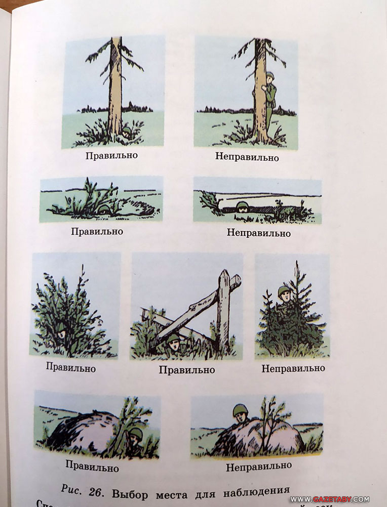 «В окопе, воронке или канаве надо располагаться так, чтобы сзади были насыпь, бугор или куст, на фоне которого голова наблюдателя незаметна».