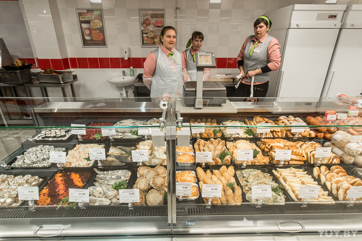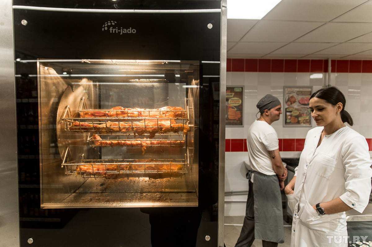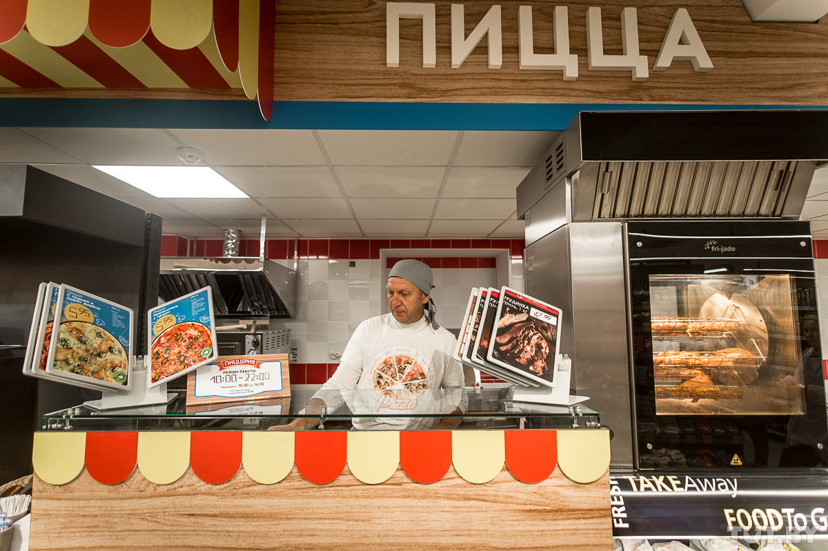 Среди новшеств в этом магазине — пицца, которую готовят на месте почти за шесть рублей, витрина с мясом на гриле, кофемашина.