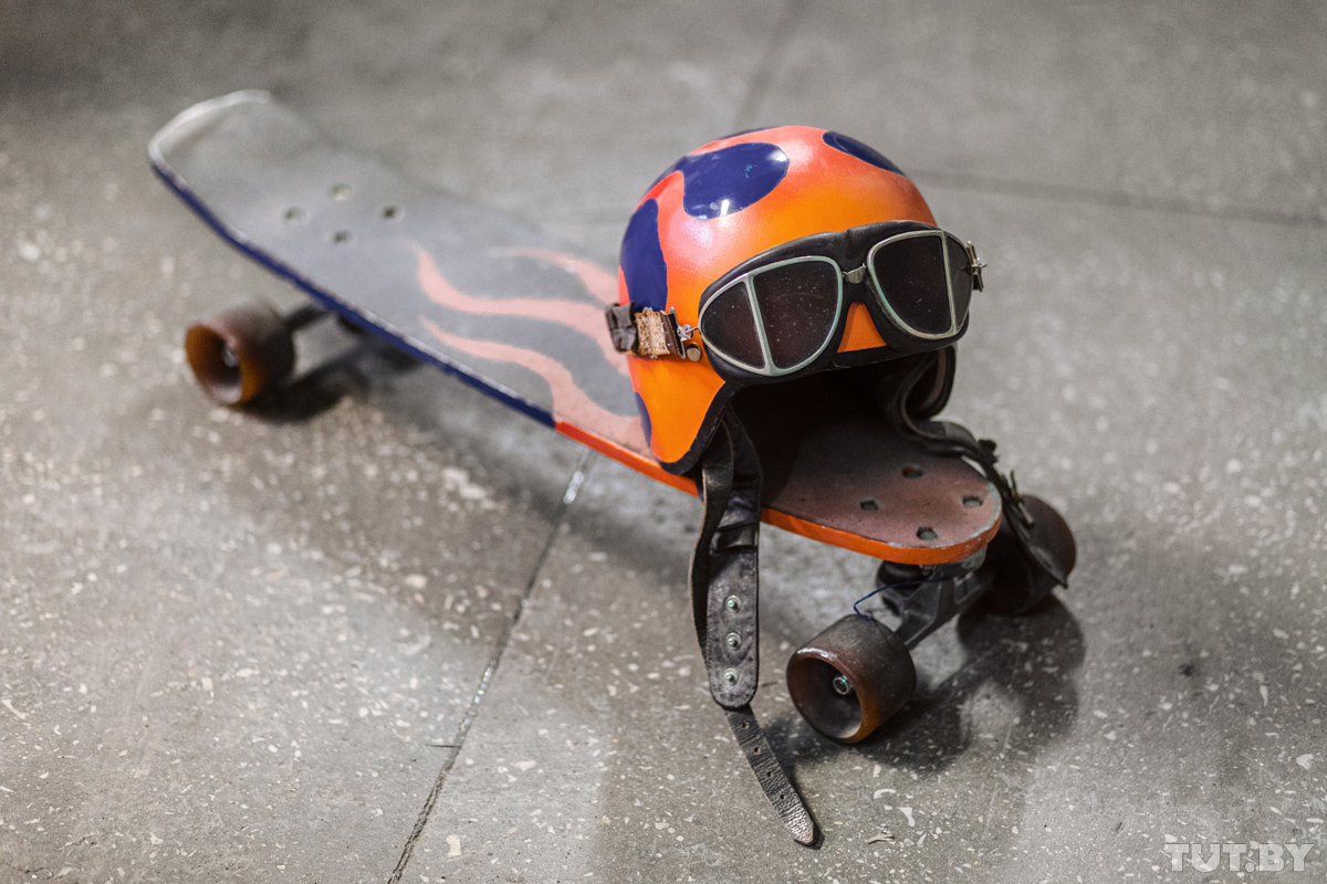 Скейт, сделанный на Андроповском производственном объединении моторостроения, который минчане доработали специально для катания в Раубичах. На нем — гэдээровский шлем-яичко и итальянские мотоциклетные очки из 1960-х