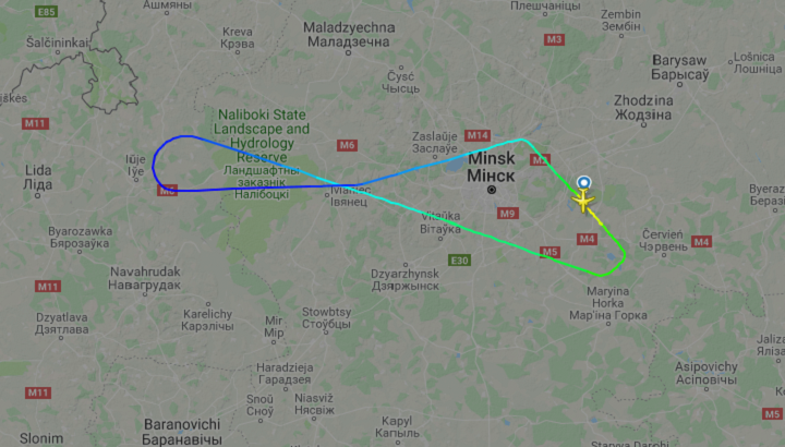 Самолет пришлось развернуть назад в небе над Ивье, еще в Беларуси. Скриншот: Flightradar24.com
