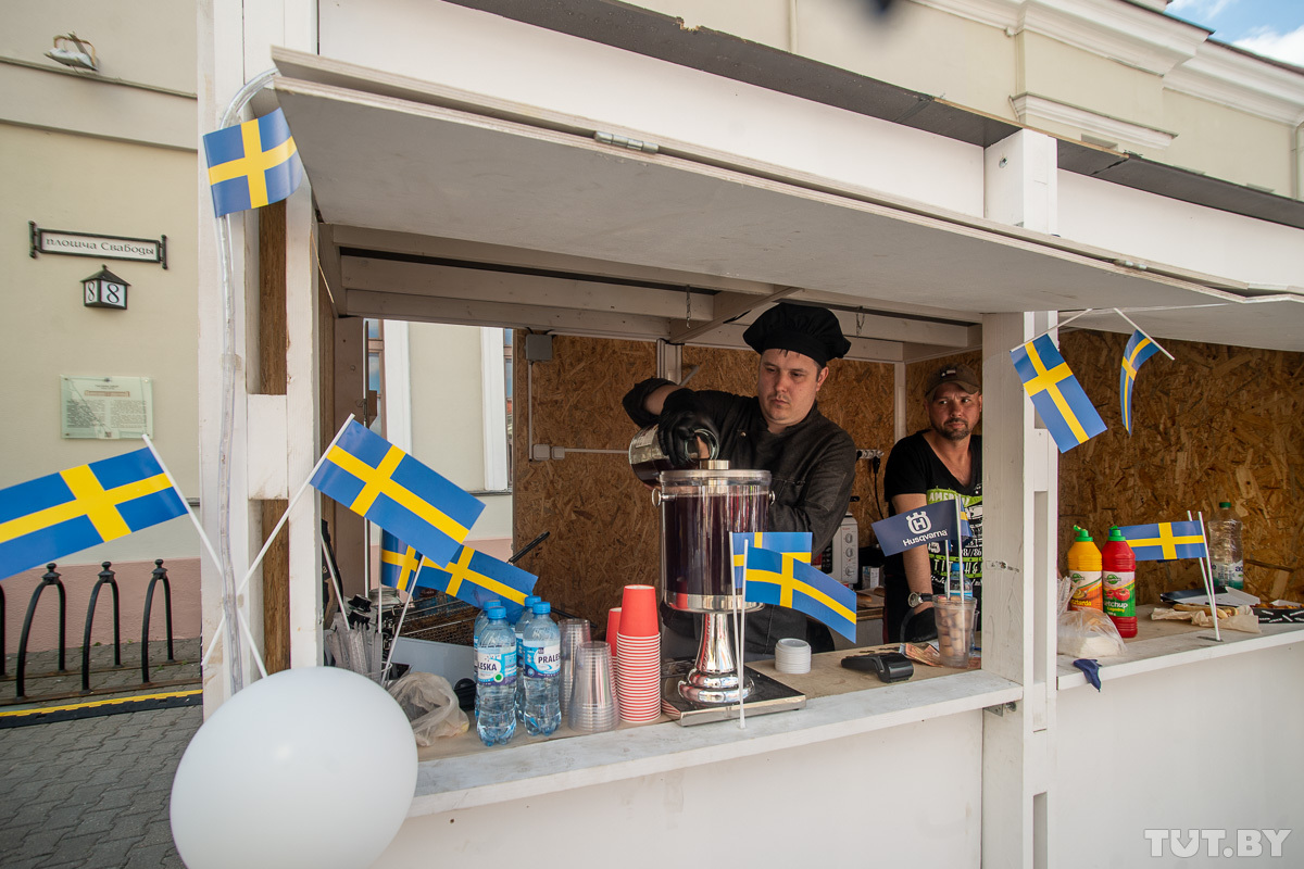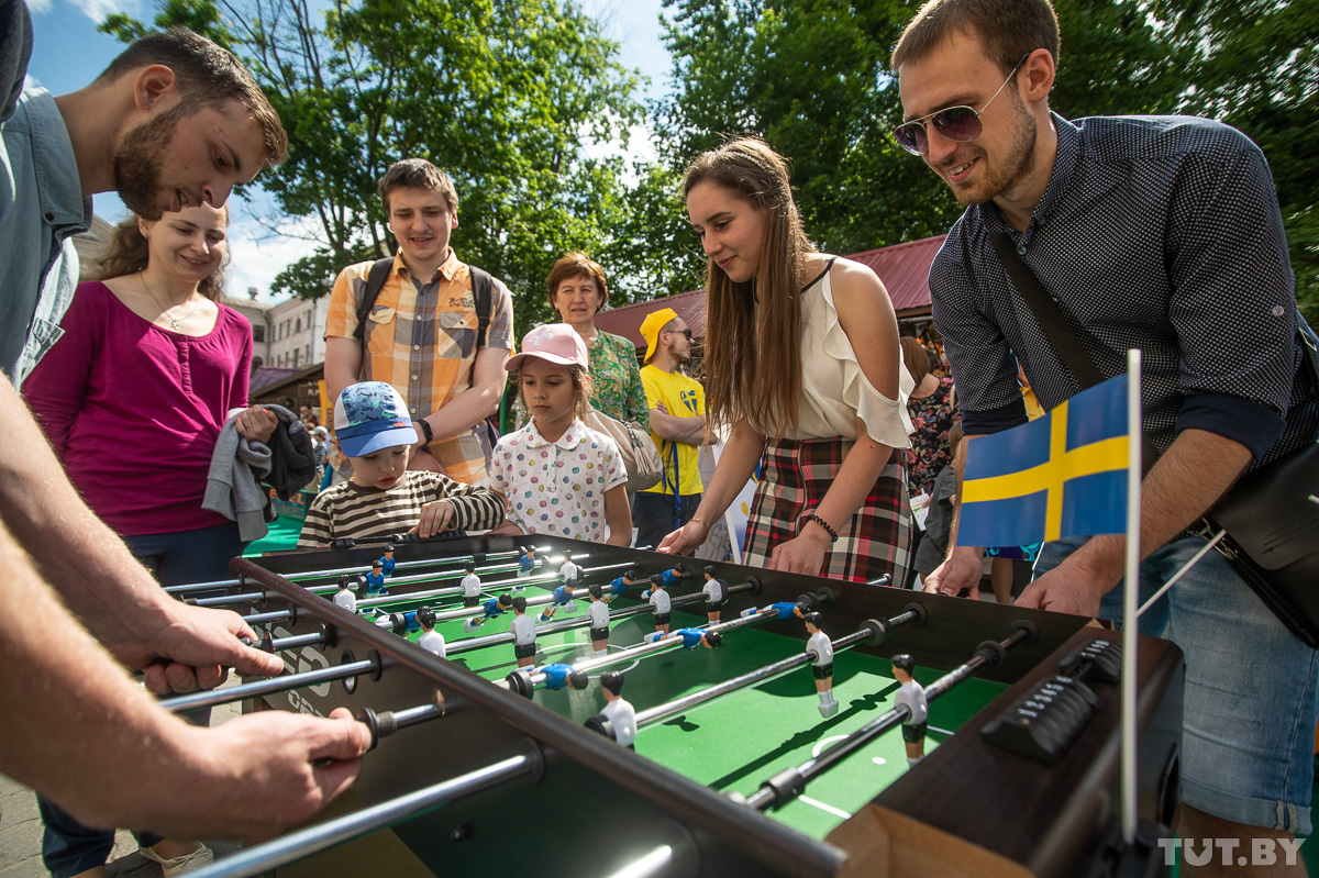 Вокруг на площадке работают фотозоны, установлены столы для настольного тенниса, аэрохоккей, мини-поле для хоккея на траве. В фудзоне продают блюда шведской кухни: сельдь на гриле за 3 рубля, гороховый суп за 5, булочки семла по 2,5 рубля, шведские фрикадельки по 6 и многое другое.
