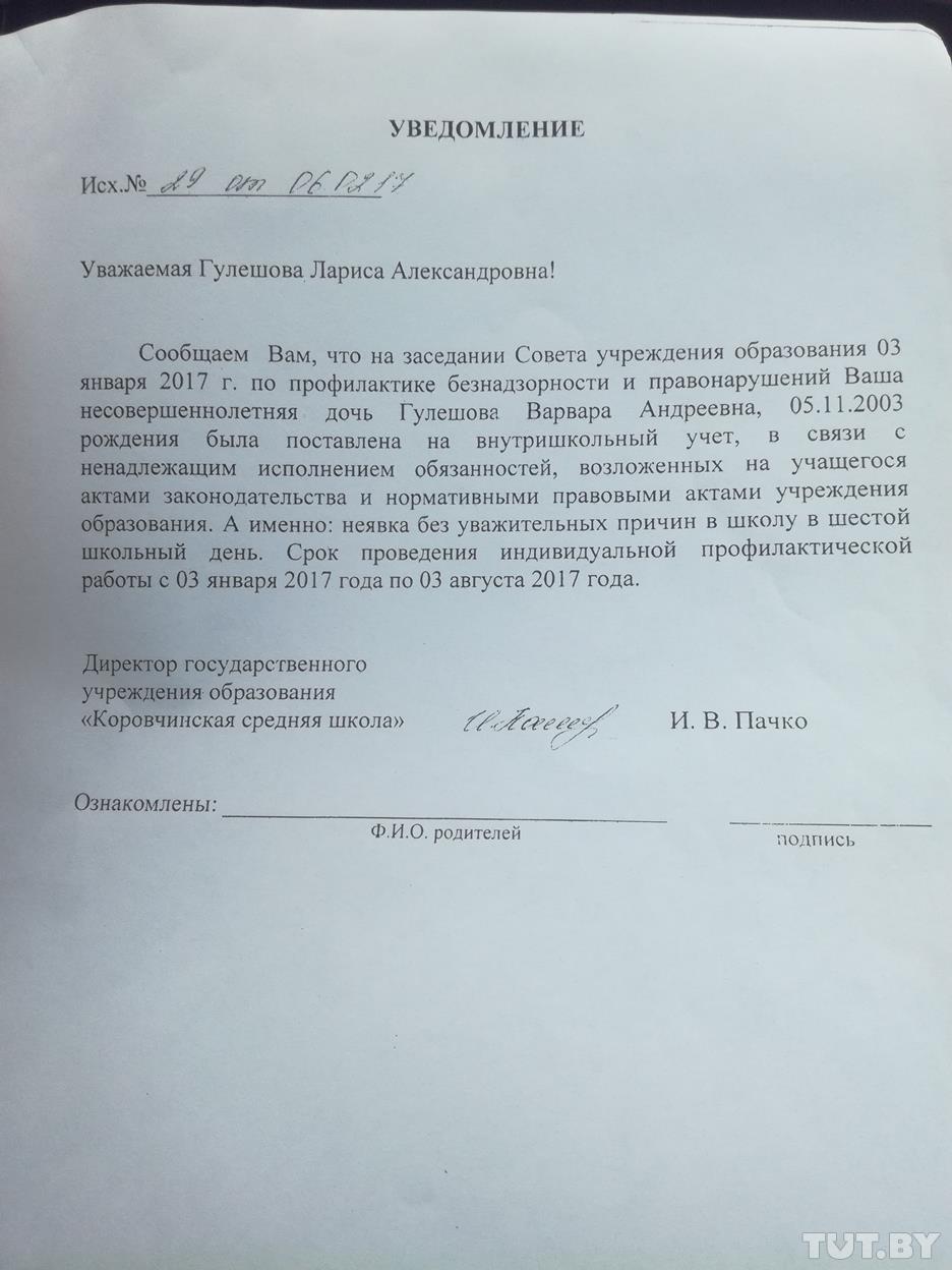 — Она нравственно крепкая девочка, у нее есть внутренний стержень. Варя всегда понимает, что правильно, а что нет. Но когда ее в школе при всех отчитывали якобы за прогулы, она плакала сначала, а потом просто слушала, потому что понимала, что она права, — говорит мать. — Мы, родители, узнали только через месяц, что ее поставили на учет. Потом мне дали уведомление расписаться. Я сказала, что эту филькину грамоту подписывать не буду, потому что не согласна с этим решением.