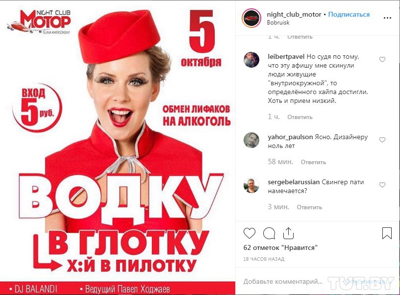 — Текст афиши утвержден директором клуба, — пояснила TUT.BY управляющая ночным клубом «Мотор» Алла. — Афиша размещена только в соцсети. Нигде в городе ее не будет.