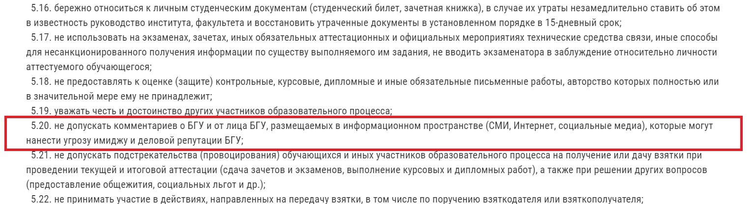 Пункт 5.20 обязывает студентов «не допускать комментариев о БГУ и от лица БГУ, размещаемых в информационном пространстве (СМИ, интернет, социальные медиа), которые могут нанести угрозу имиджу и деловой репутации БГУ».