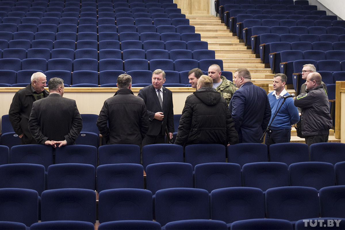 На 15-й минуте собрания к микрофону подошли лидеры аккумуляторного протеста Александр Кабанов и Дмитрий Бекалюк, которых Александр Рогачук лично пригласил на встречу.