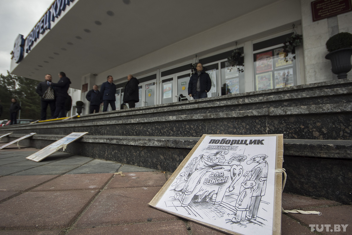 На митинг Виталий Николаевич принес карикатуры, иллюстрирующие пороки в лицах: бюрократ, коррупционер, поборщик и другие. Шаржи активист раскладывал на ступеньках перед входом в ДК профсоюзов под аккомпанемент гимна противников аккумуляторного завода — песни «Жить», которая разносилась по площади из колонок. Завершив работу над инсталляцией, Виталий Николаевич подошел к микрофону, высказался по поводу завода АКБ, напомнил, что единственного участника аккумуляторного протеста Владимира Мороза 1 ноября сняли с избирательной гонки, — а потом передал слово кандидату в депутаты от партии «Справедливый мир» Александру Пасю. Политик был краток: поздоровался, представился, сказал, что он за справедливость, — и вернул микрофон.