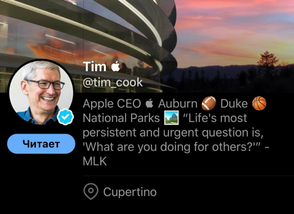 Тим Кук сменил имя на «Тим Эппл» в Twitter после того, как Дональд Трамп назвал его так по ошибке. Для этого гендиректор Apple использовал значок логотипа компании, который отображается только на устройствах Apple, пишет TJournal.