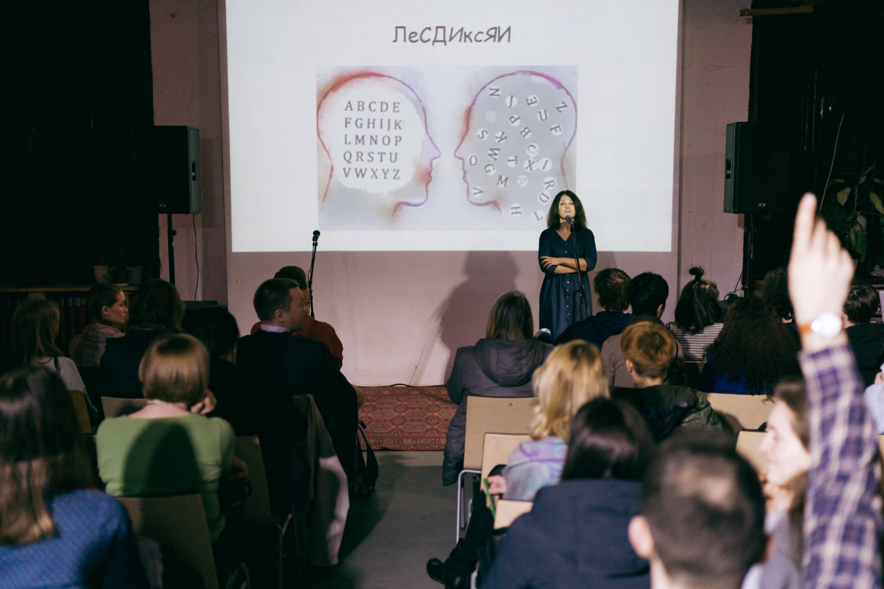 В культурном центре «Корпус» прошла открытая лекция о дислексии с кандидатом психологических наук Анной Давидович. Фото: Антон Кизерев, страница в Facebook Dyslexia Belarus