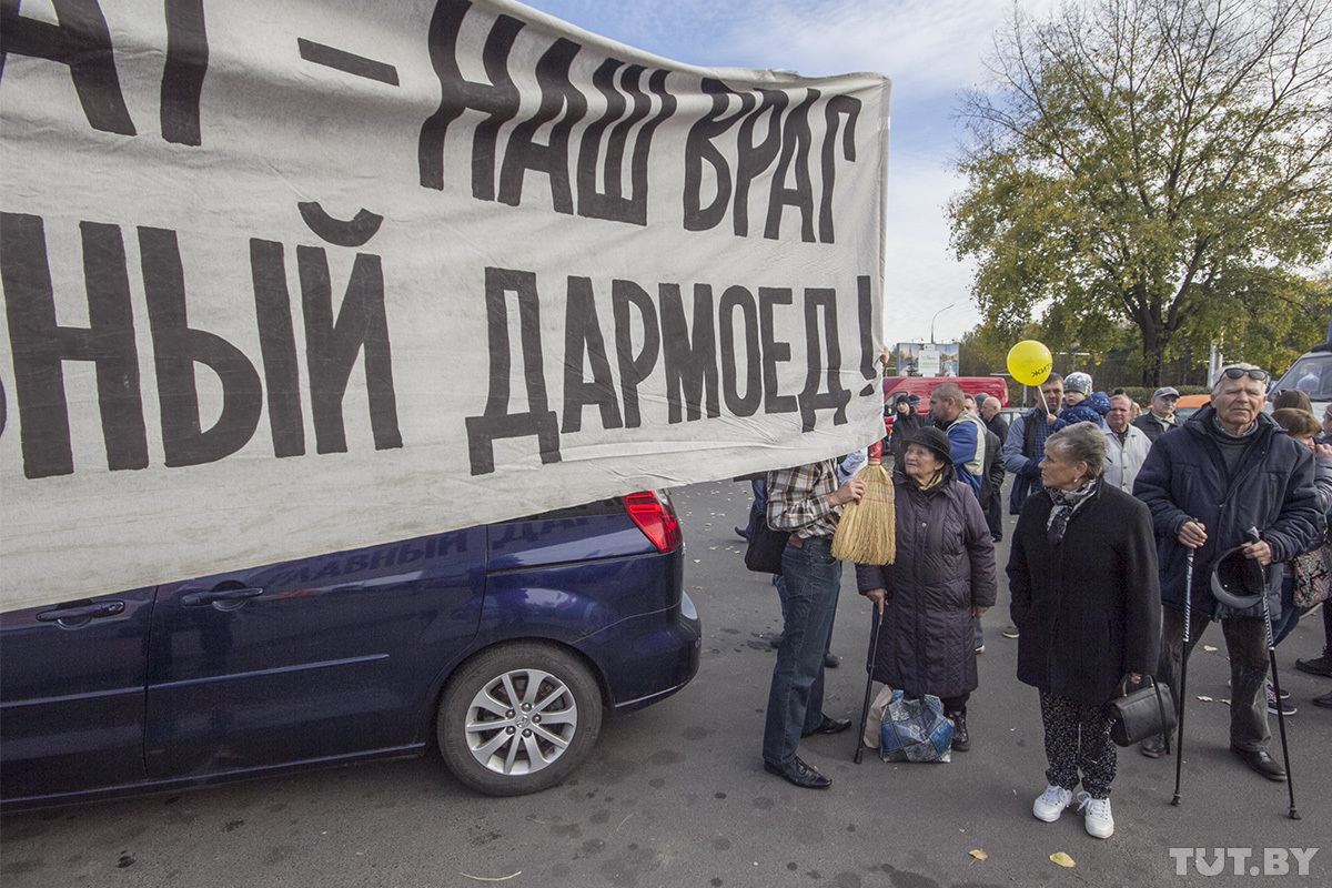 Участники пикета развернули два транспаранта: «Пераможам!» и «Бюрократ — наш враг и главный дармоед»