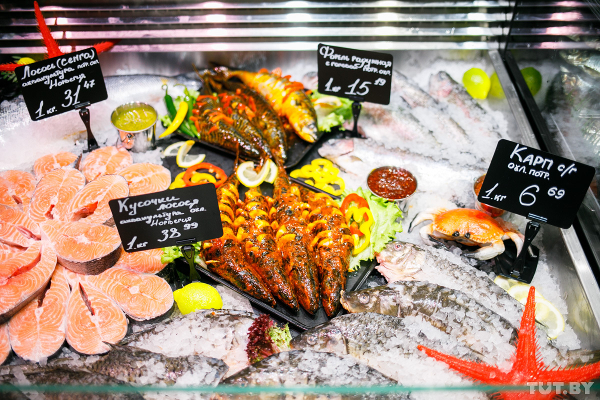 Из дополнительных услуг, к которым еще не привыкли в минских магазинах: если покупателю нужно, рыбу здесь очистят и разделают — бесплатно. То же самое с мясом: можно купить готовый фарш, а можно попросить продавца приготовить фарш именно из тех кусков мяса, которые покупателю понравились.
