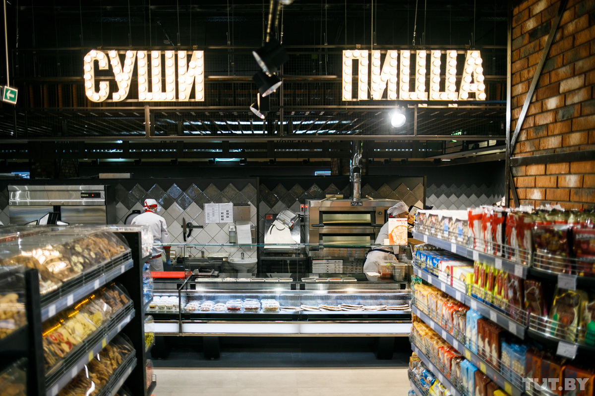 В магазине есть зона, где повара выпекают пиццу и готовят суши, она открытая. В торговом зале стоит пароконвектомат для приготовления гриля, с теплой витриной.
