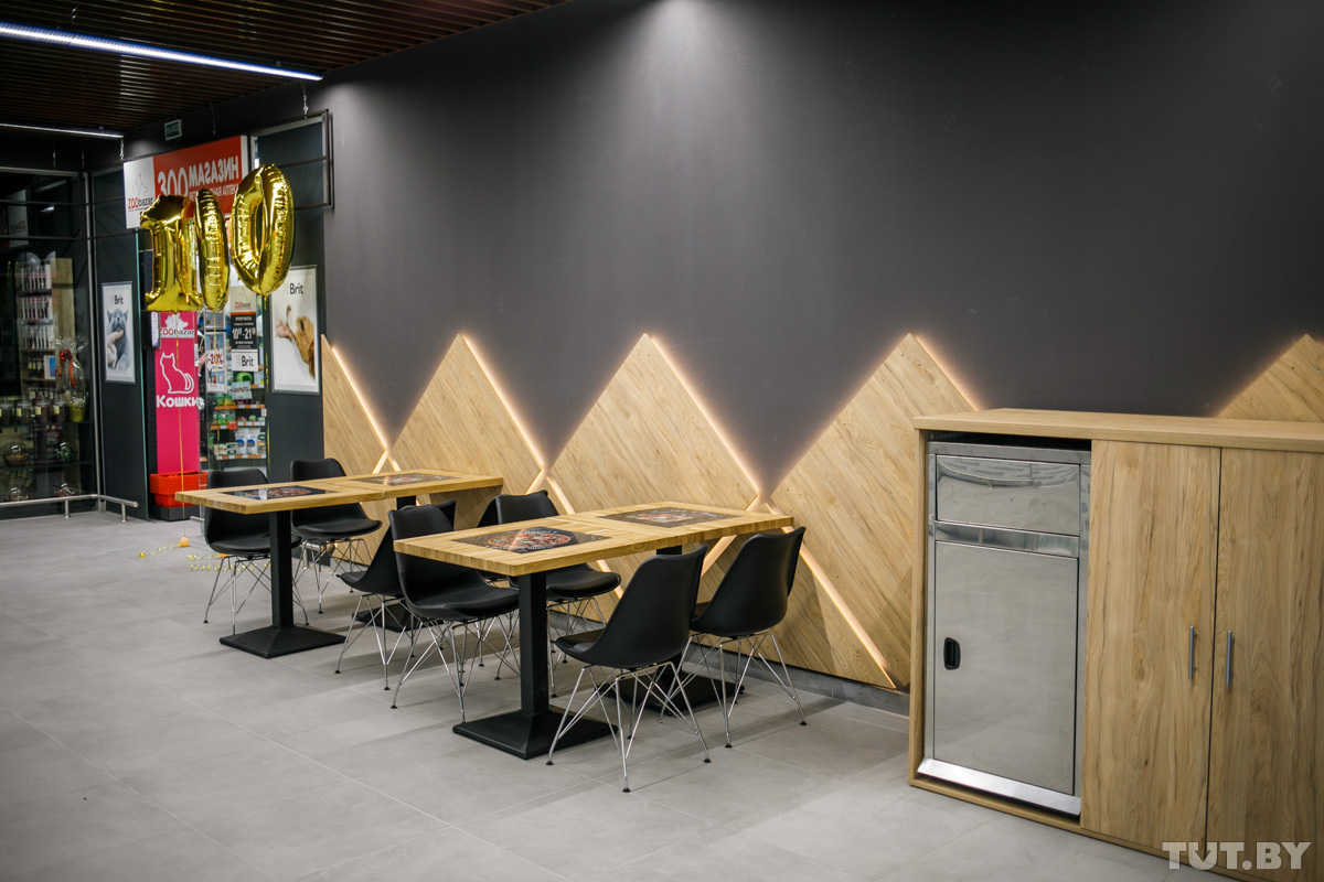 — В этом магазине мы сделали небольшую зону посадки — с кофеавтоматом за кассовой линейкой для тех, кому хочется перекусить прямо сейчас. Все, что куплено в магазине, можно разогреть в микроволновой печи — и пообедать за столиками в уютной зоне.