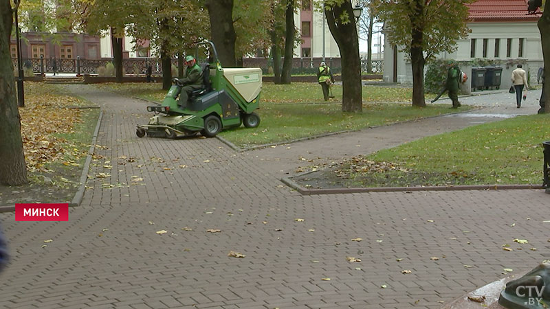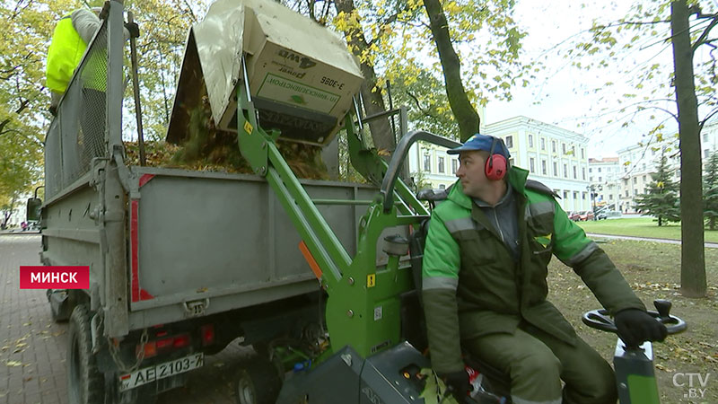 — Одновременно с уборкой листвы идет подстрижка газона и все это измельчается и собирается в бункер, — рассказала специалист УП «Минскзеленстрой» Анжелика Пузанкова.