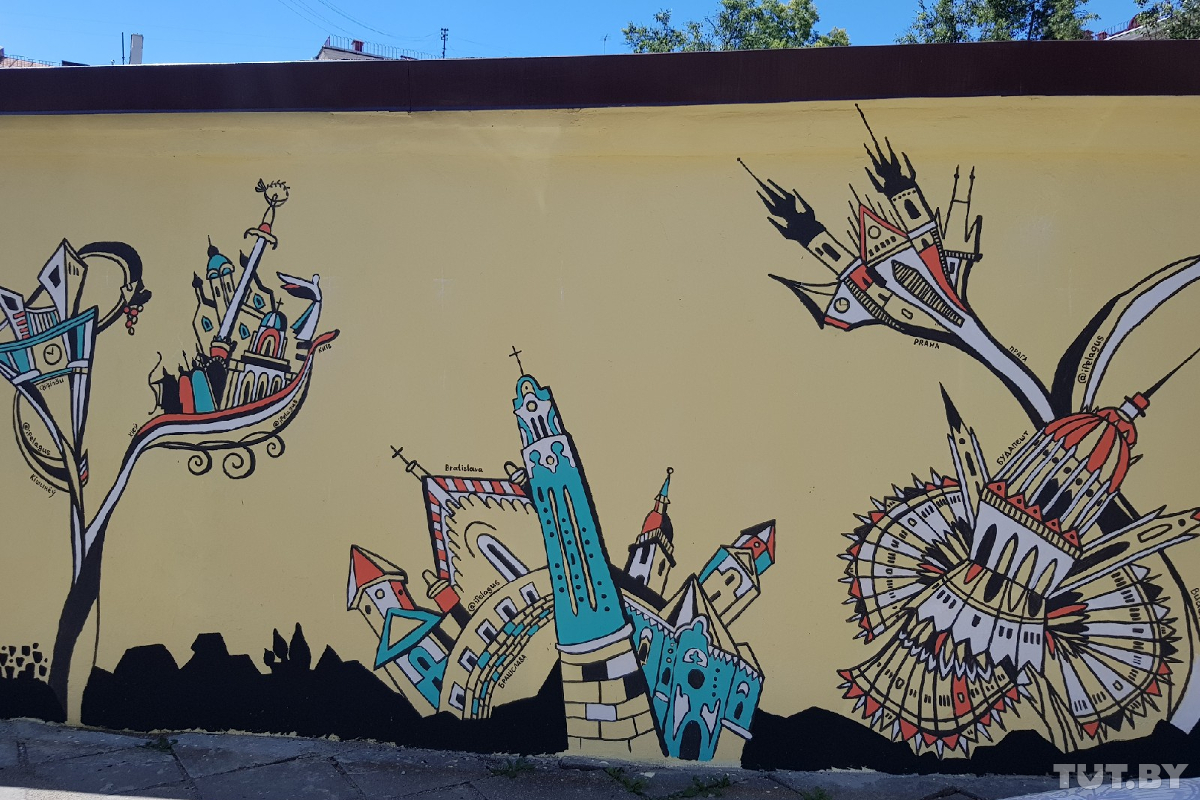 За месяц на гаражах во дворе дома на Независимости, 12, появился мурал. На нем в виде цветов изображены европейские города. Их нарисовала художница по просьбе местных жителей.