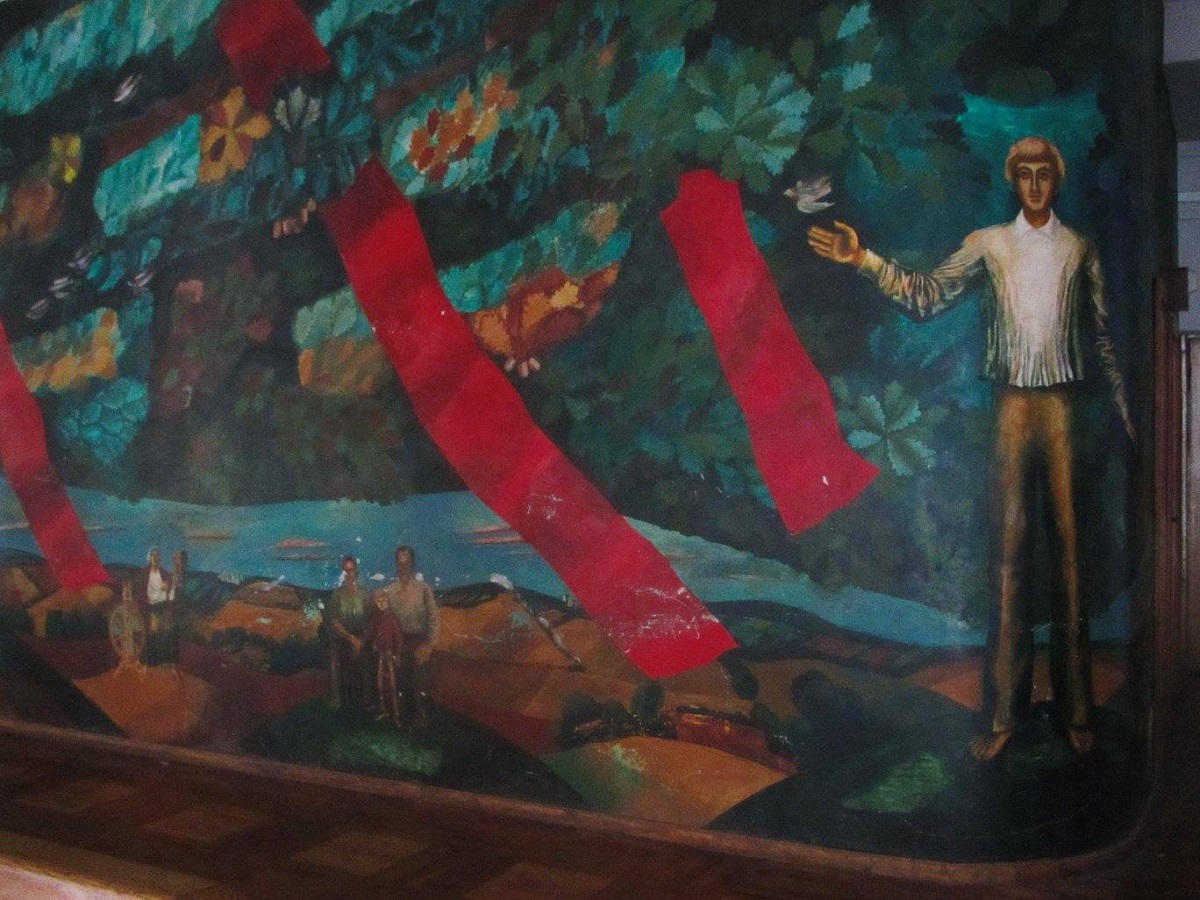 Роспись размещается на третьем этаже Дворца железнодорожников на улице Чкалова, там как раз сейчас идет ремонт.