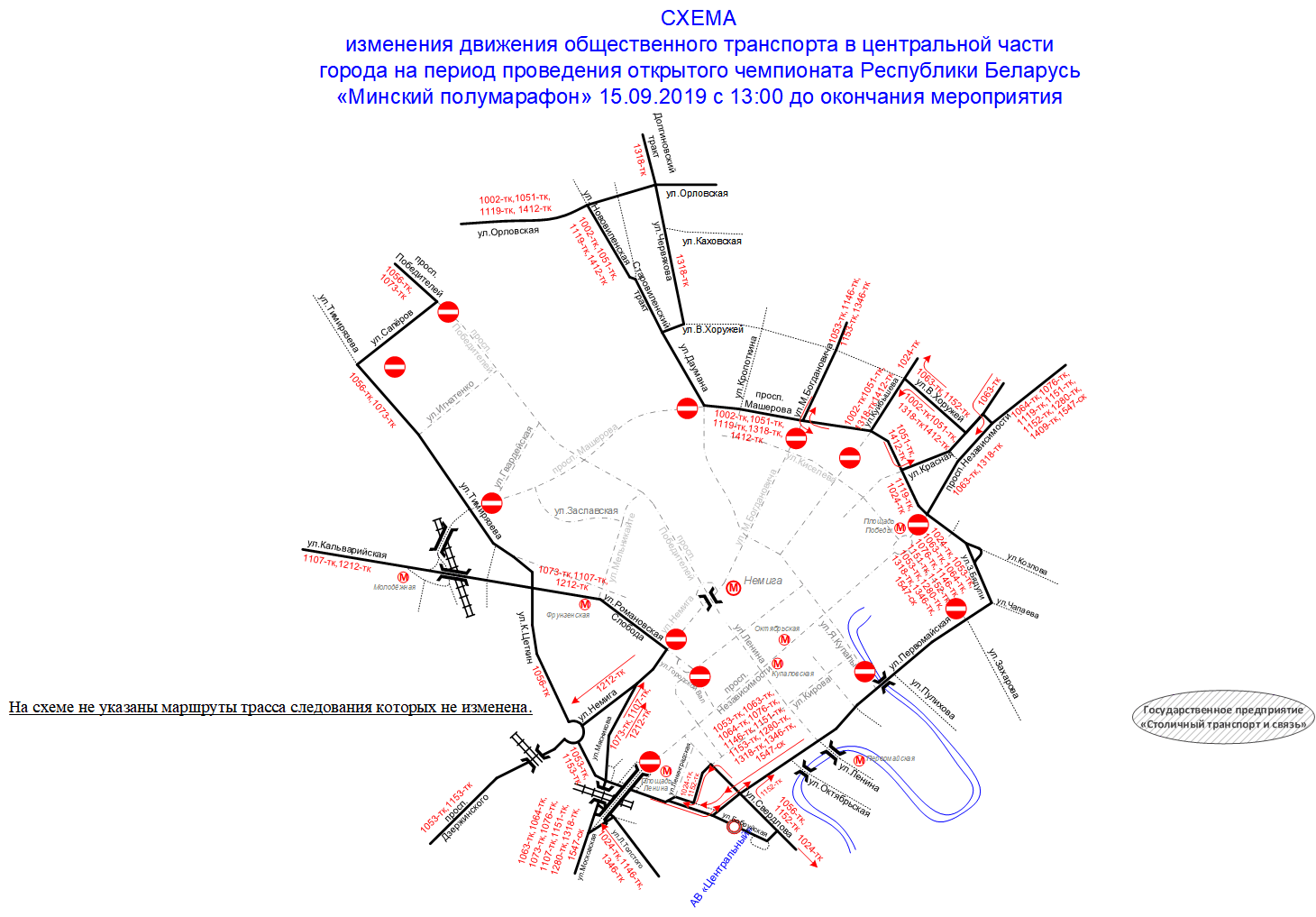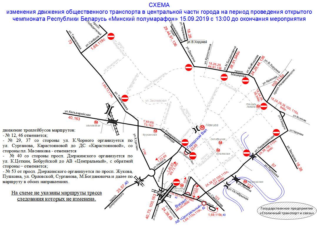 — № 1, 69 будут следовать от разворотного кольца «Бобруйская» по улицам Бобруйская, Мясникова, Немига, Романовская Слобода, Кальварийская, Тимирязева, Саперов, проспекту Победителей и далее по маршрутам в прямом направлении и по проспекту Победителей, улицам Саперов, Тимирязева, Кальварийская, Романовская Слобода, Немига, К. Цеткин, Бобруйская в обратном направлении;