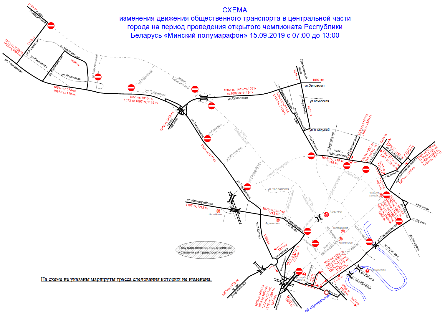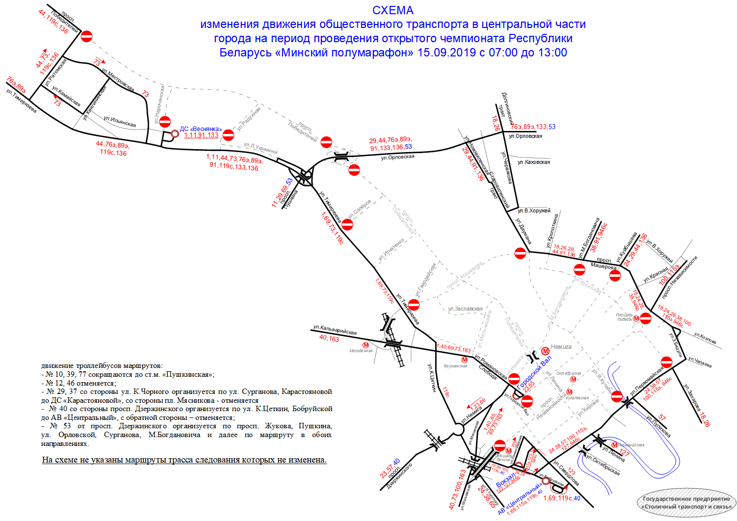 — с 07:00 до 16:00 по пр. Победителей на участке от пр. Независимости до ул. Саперов, по пр. Независимости на участке от ул. Бобруйской до ул. Козлова, по ул. Володарского на участке от пр. Независимости до ул. Кирова, по ул. Комсомольской на участке от пр. Независимости до ул. Кирова, по ул. Ленина на участке от пр. Независимости до ул. Кирова, по ул. Энгельса на участке от пр. Независимости до ул. Кирова, по ул. Киселёва на участке от пр. Независимости до ул. Красной, по ул. Захарова на участке от ул. Первомайской до пл. Победы, по местному проезду пр. Независимости от ул. Киселёва до ул. Коммунистической, по ул. Коммунистической на участке от ул. Куйбышева до местного проезда пр. Независимости, по ул. Куйбышева на участке от ул. Киселёва до ул. Я. Купалы, по ул. Я. Купалы на участке от ул. Первомайской до ул. М. Богдановича, по ул. Немига — ул. М. Богдановича на участке от ул. Городской Вал до пр. Машерова, по ул. Сторожевской на участке от ул. М. Богдановича до пр. Машерова, по пр. Машерова на участке от пр. Победителей до ул. Заславской, на перекрестках ул. М. Богдановича, Я. Купалы и Сторожевской, по пр. Победителей на участке от ул. Ленина до ул. Саперов, по пр. Независимости от ул. Козлова до ул. Московской, по пр. Машерова от пр. Победителей до ул. Тимирязева, по ул. Захарова от ул. Первомайской до пл. Победы, по ул. Я. Купалы, по ул. Киселева от ул. М. Богдановича до пл. Победы, по ул. Ленина от пр. Победителей до пр. Независимости, по ул. Заславской, по ул. Куйбышева от ул. Я. Купалы до пр. Машерова;