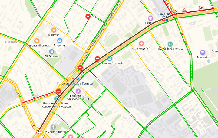 На карте — один из перекрытых участков, на проспекте Независимости. Изображение: Яндекс.Карты