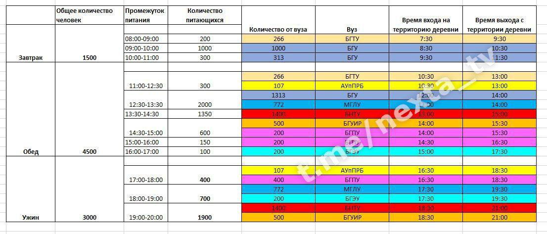 Вечером 5 июня в телеграм-канале Nexta появилось расписание, в нем указано, кто и когда должен прийти поесть. По этой информации, на завтраке должны были побывать 1500 человек, на обеде — 4500, на ужине — 3000. Больше всего студентов привлекут от БНТУ и БГУ.