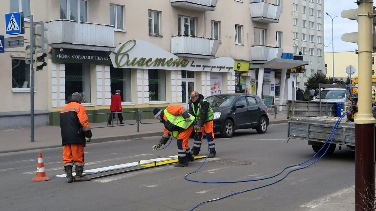 Днем 20 марта активнее всего велись работы в центре города. На дороги наносили новую дорожную разметку, красили столбы и заборы, мыли окна и козырьки зданий.