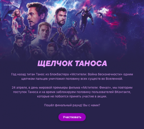 «ВКонтакте» предложила пользователям присоединиться к акции «Щелчок Таноса», приуроченной к мировой премьере фильма «Мстители: Финал», сообщает Meduza.
