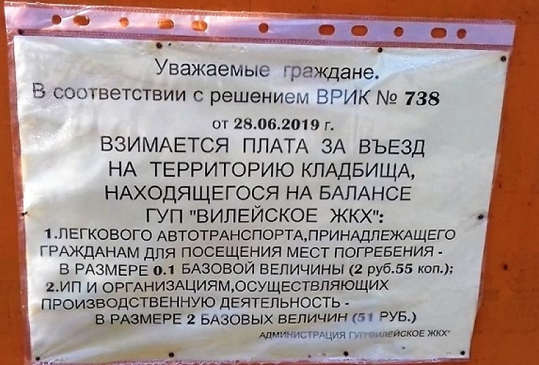 О взимании платы за проезд предупреждает объявление за подписью администрации ГУП «Вилейское ЖКХ», на балансе которого находится кладбище. В объявлении — ссылка на решение Вилейского райисполкома от 28 июня 2019 года № 738.
