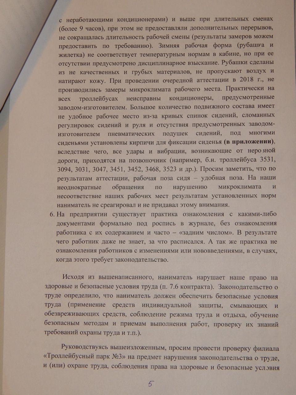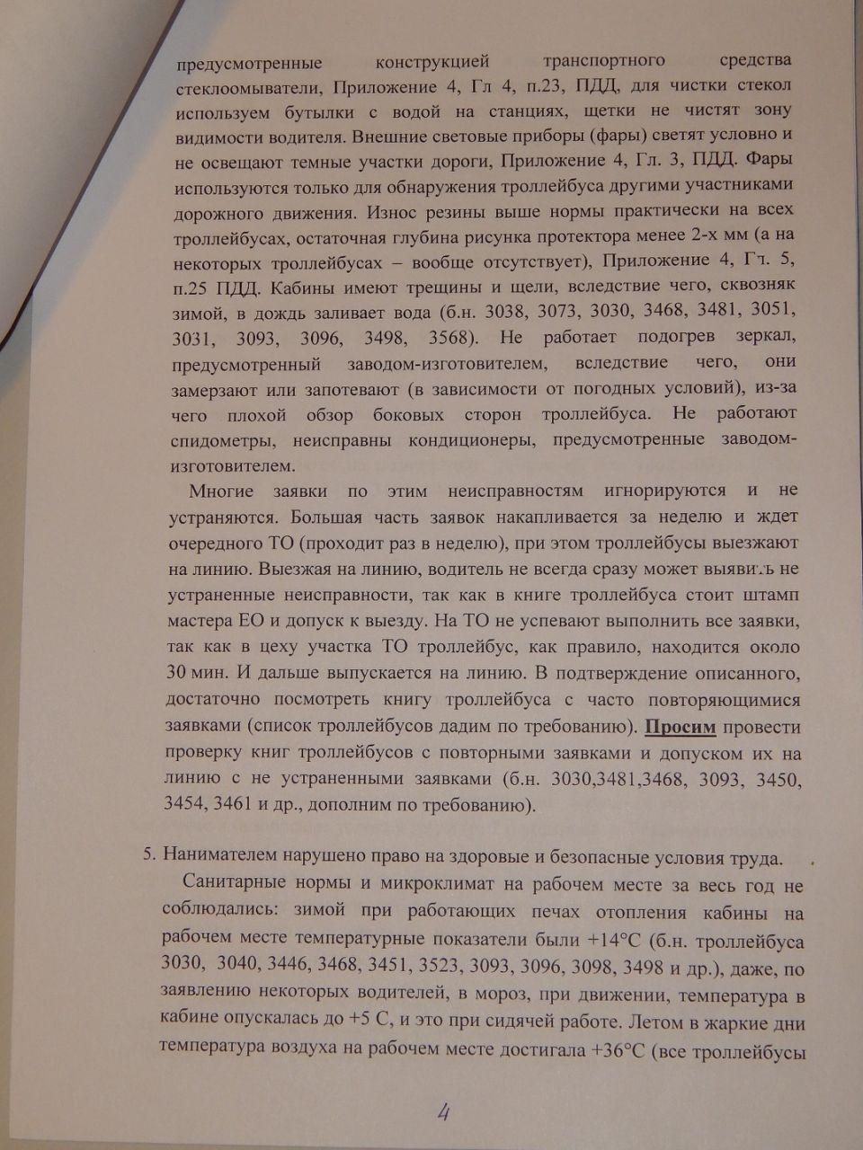 «Износ резины выше нормы практически на всех троллейбусах. Кабины имеют трещины и щели, вследствие чего сквозняк зимой, в дождь заливает вода. Не работает подогрев зеркал, предусмотренный заводом-изготовителем, вследствие чего они замерзают и запотевают (независимо от погодных условий), из-за чего плохой обзор боковых сторон троллейбуса. Не работают спидометры, неисправны кондиционеры, предусмотренные заводом-изготовителем», — отмечается в письме.