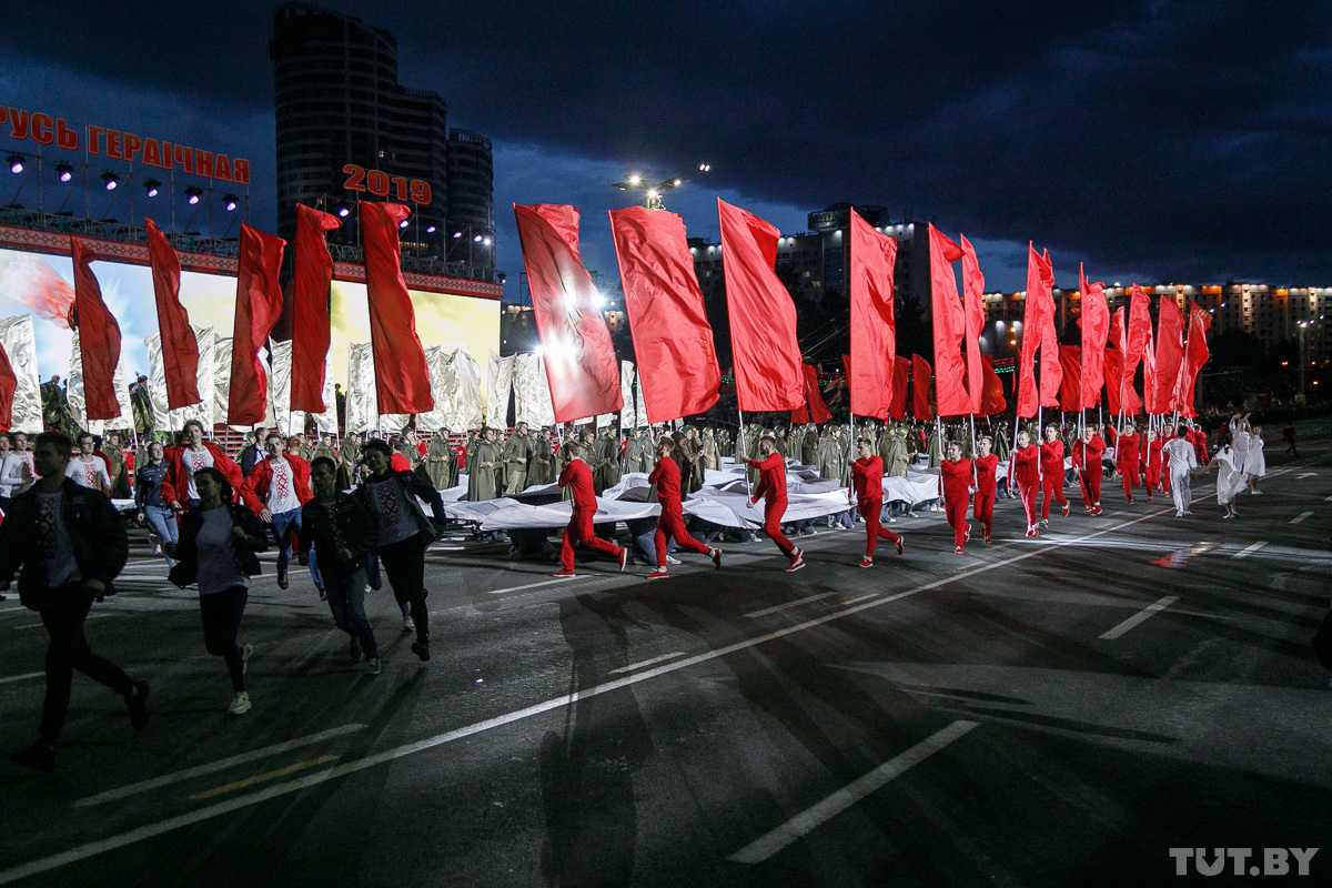 Знаменные группы пронесли Знамя Победы, Государственный флаг Беларуси и флаг СССР, за ними — штандарты фронтов, освобождавших Беларусь, и боевые знамена партизанских формирований.