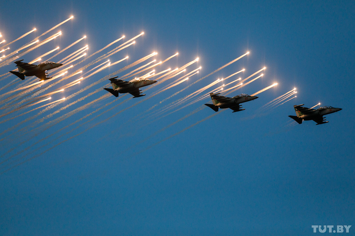 Открыла парад авиация. В небе над столицей пролетели вертолеты Ми-8МТВ5 и Ми-24, учебно-боевые самолеты Л-39 и Як-130, штурмовики Су-25, истребители МиГ-29 и военно-транспортные самолеты Ил-76 и Ан-26. Максимальная высота, на которой прошли самолеты, — около 250 метров.