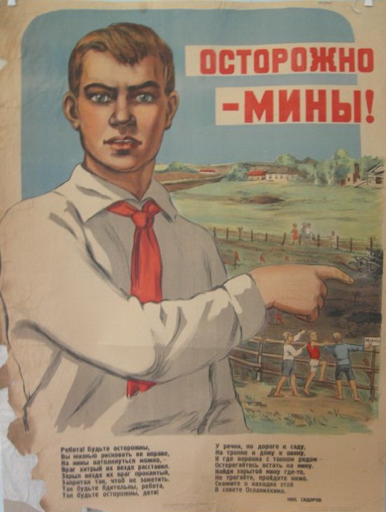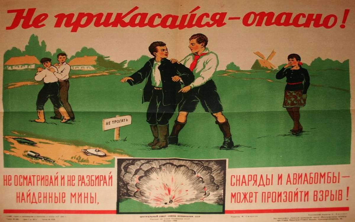 Здесь и дальше — примеры плакатов, которые издавались в том числе Осоавиахимом. В них в первую очередь разъясняли опасность найденных мин детям и школьникам