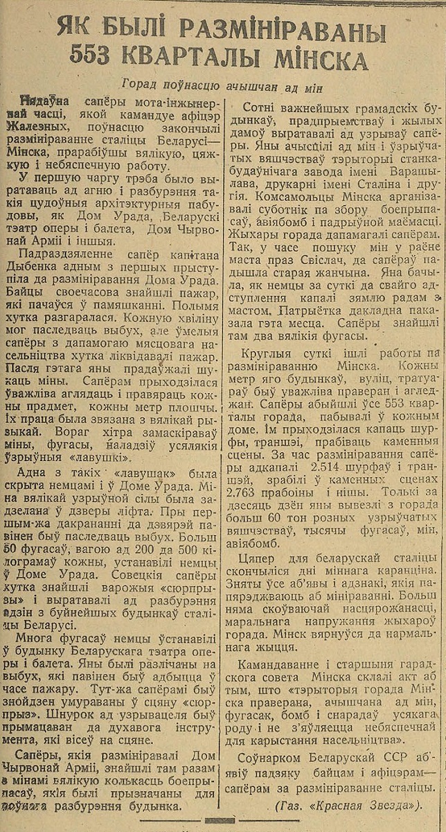 Заметка из газеты «Звязда» за 20 октября 1944 года, в которой указывалось, что военные саперы передали территорию Минска гражданским властям. Территория Минска очищена от мин, фугасок, бомб и снарядов всякого рода, заявляла газета