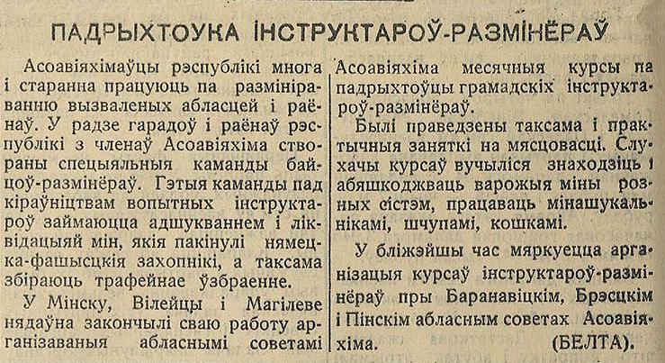 Уже 30 сентября 1944 года газета «Звязда» опубликовала краткую заметку, в которой упоминалось, что в городе были проведены месячные курсы по подготовке гражданских инструкторов-разминеров. Именно они были теперь ответственны за очистку города от смертоносного металла, которого оставалось еще достаточно много
