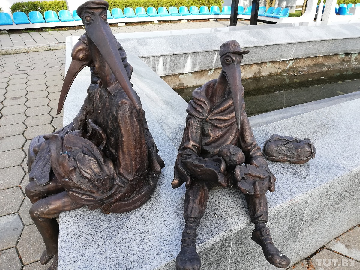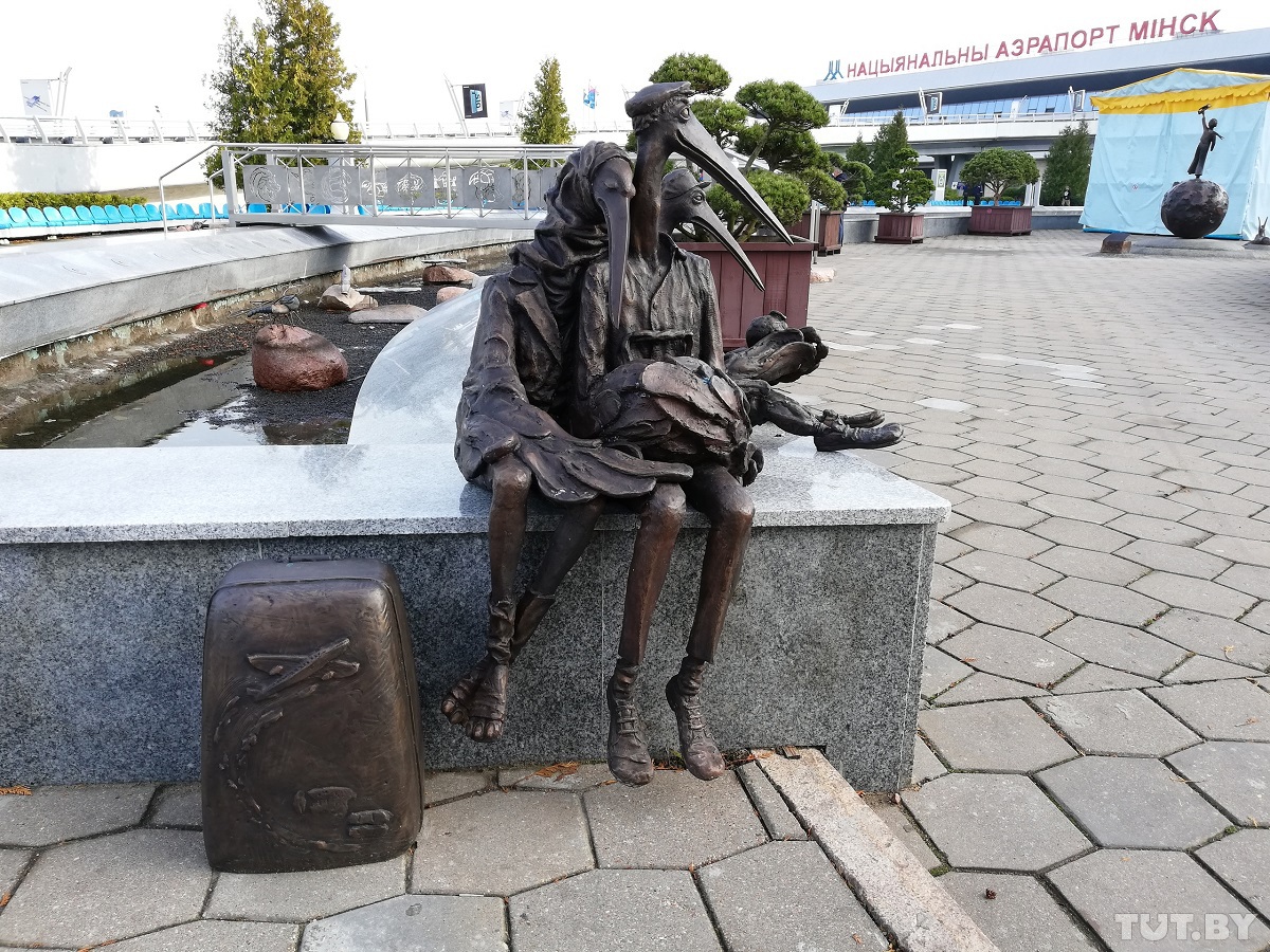 Семья аистов присела у фонтана перед зданием аэропорта в ожидании своего рейса. Папа — старомодный простак, мама — модница, сынок — ультрасовременный подросток, объяснил скульптор сюжет работы в Instagram.