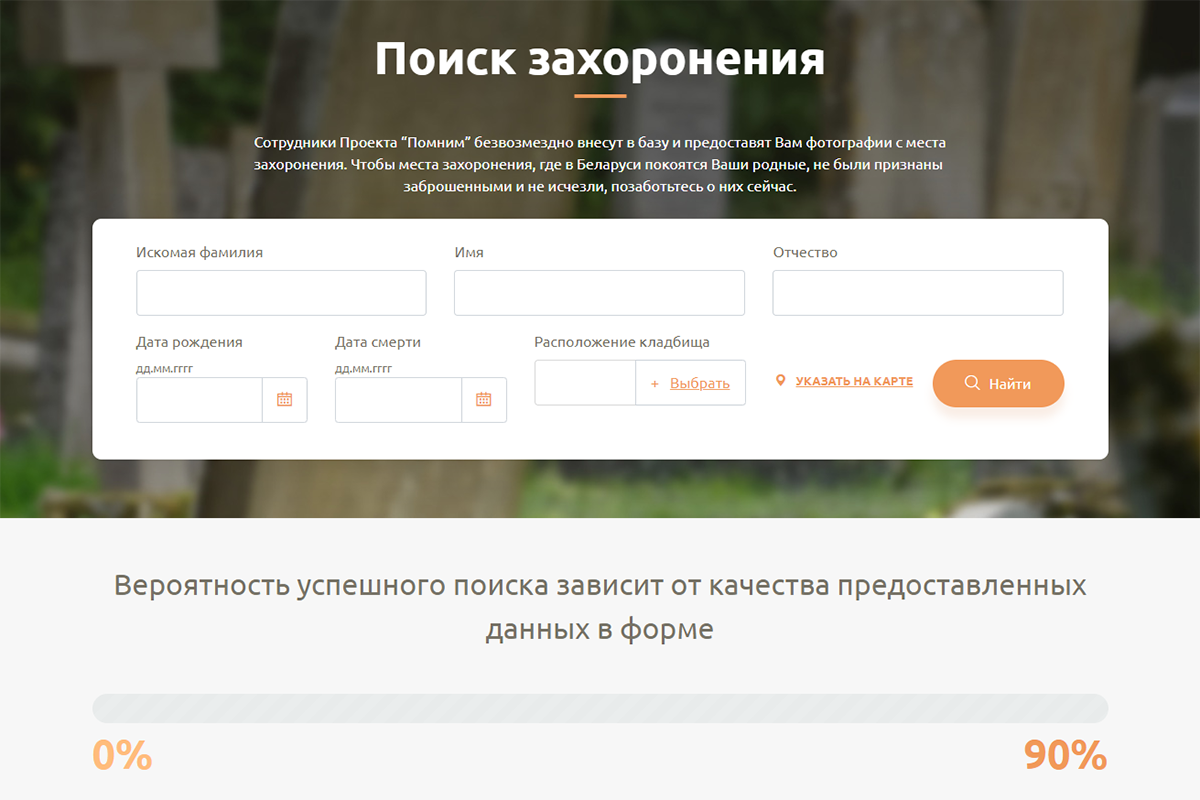 — Все зависит от того, сколько запросов мы получили на эту местность. Должно набраться хотя бы 20. После этого наш сотрудник выезжает на конкретное кладбище, фотографирует все памятники, которые там есть, и вносит данные. Чем больше информации вы заполните (имя, фамилию, дату рождения, область захоронения), тем выше шанс того, что наши сотрудники найдут нужную могилу. И, разумеется, мы все это делаем бесплатно.