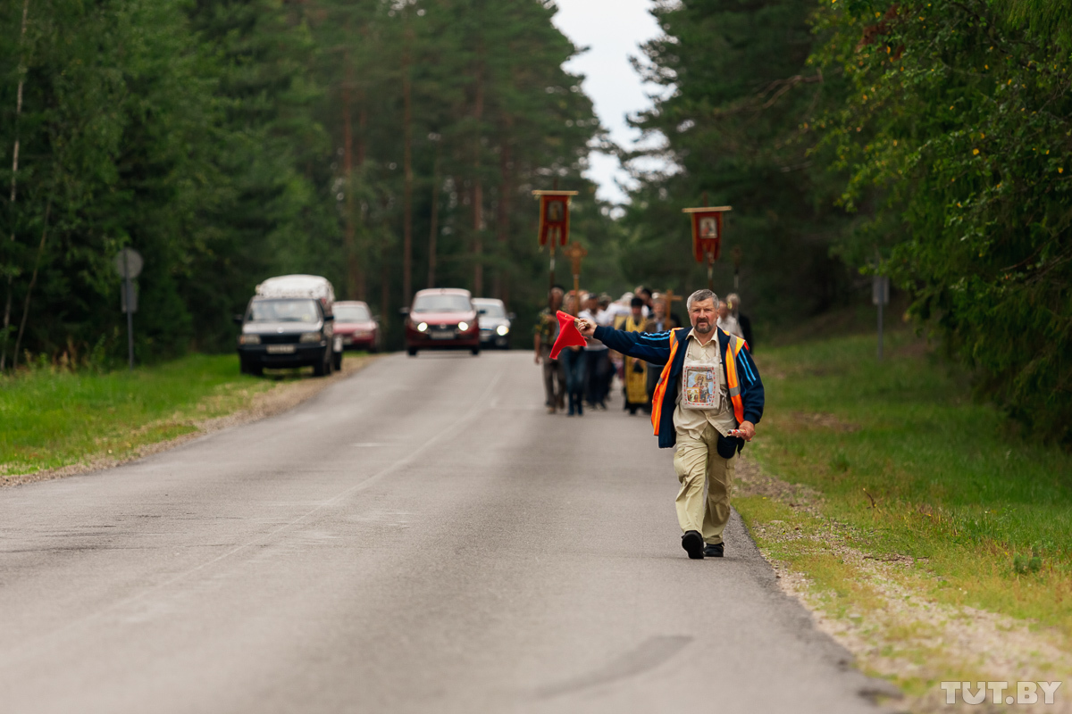 Мы присоединились к паломникам возле деревни Лесины — и через три часа все вместе уже входили в Полоцк. Общаться с людьми получалось лишь на двух коротких привалах — разговаривать в крестном ходу строго запрещено. Впереди и позади крестного хода идут паломники в оранжевых жилетках и с красными флажками. «Я — наша местная крестоходовская ГАИ, слежу за безопасностью движения», — шутит мужчина, который возглавлял шествие.