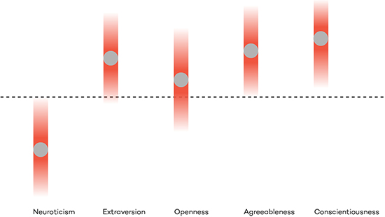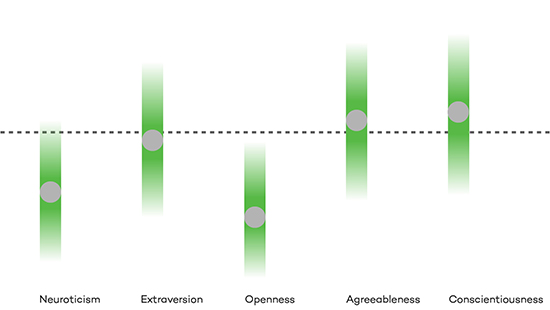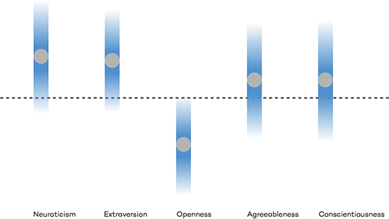 «Средний». Эти люди имеют высокие показатели нейротизма и экстраверсии и низкую открытость. Это самый распространенный тип личности.
