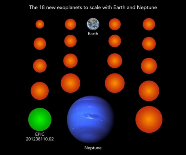 Размеры 18 новых экзопланет в сравнении с размерами Земли и Нептуна