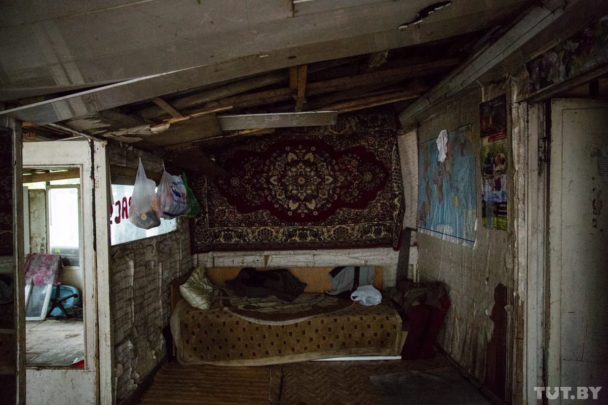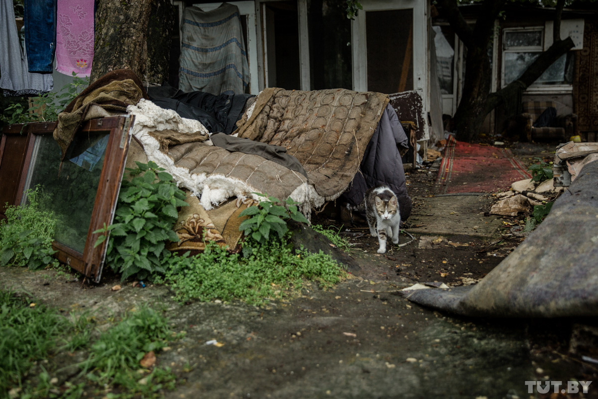 Покосившийся, наполовину разрушенный дом по адресу: улица Школьная, 12, в Минске его обитатели между собой называют фазендой. В пасмурную погоду он выглядит печальнее обычного. Свет из окон позволяет рассмотреть в полумраке, что все кровати аккуратно застелены, вещи развешаны по крючкам, а по полкам расставлены самые разнообразные предметы: детские игрушки, распятия, кастрюли… К стене приставлены чьи-то костыли, под потолком сушатся кроссовки. По дому по-хозяйски передвигаются несколько кошек, совершенно не боясь чужих. Наверное, уже привыкли к постоянной текучке «кадров».