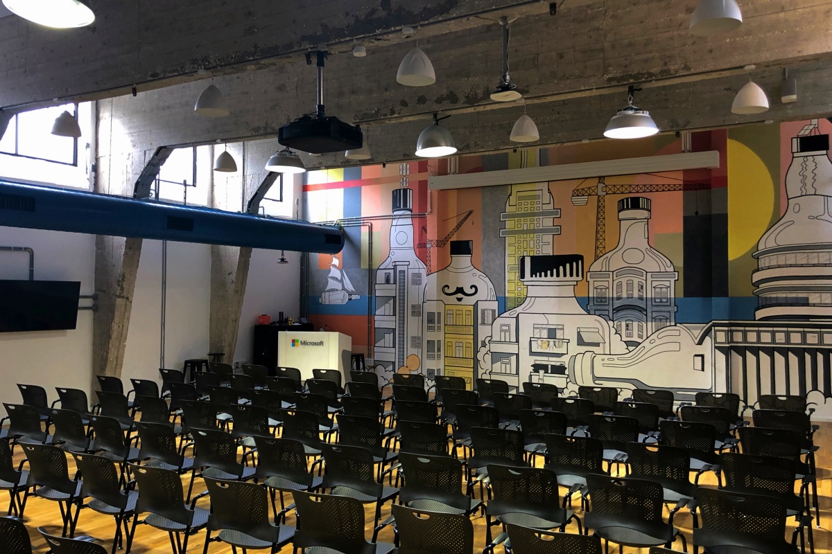 Голые бетонные стены в конференц-зале, может, кого и смущают, но только не Microsoft. Здесь собирают израильских стартаперов на всевозможные конференции и «митинги». Главную стену разрисовали зданиями-бутылками. Интерьер максимально аскетичен.