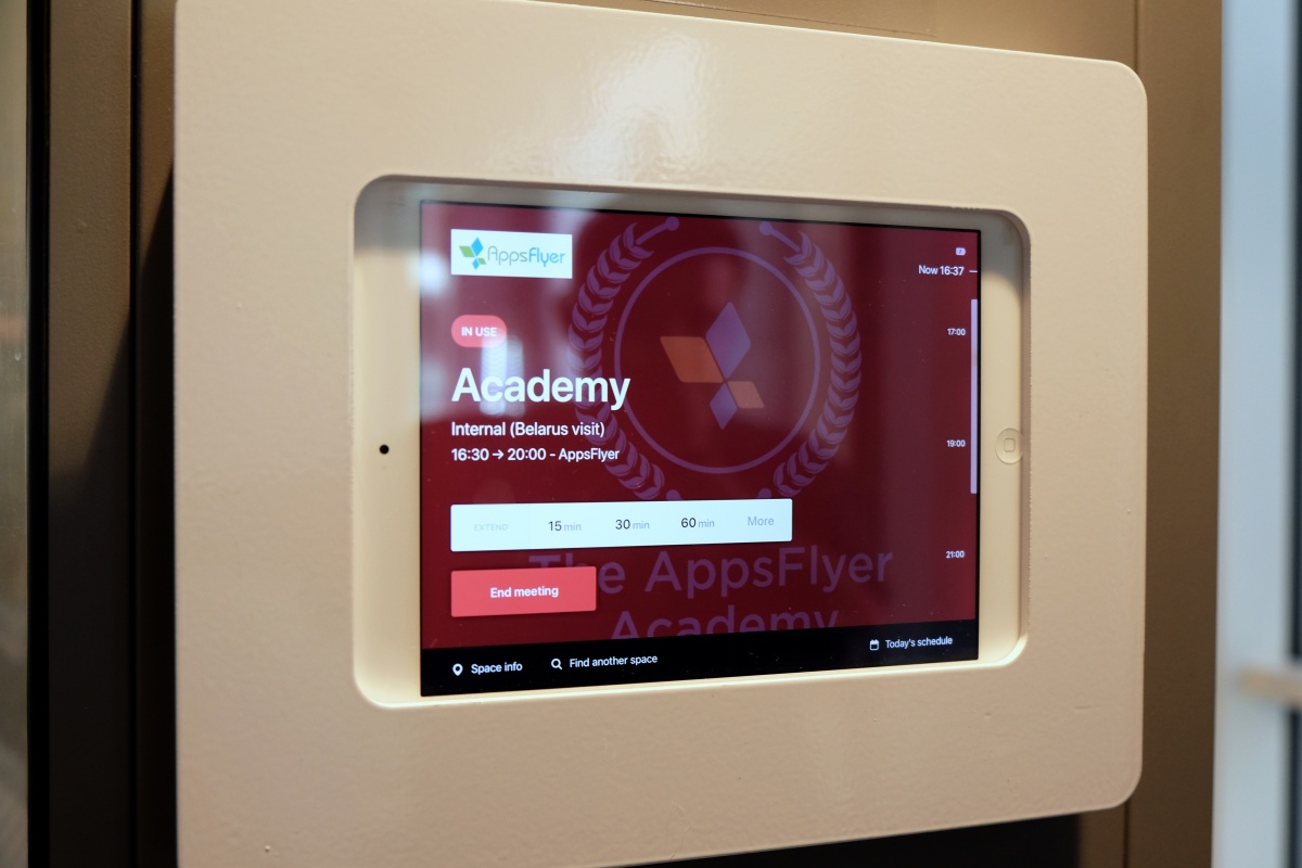 Чтобы не запутаться, у каждой переговорки установлен дисплей с расписанием. Кто забронировал — тот и пользуется. Для белорусов выделили целых 3,5 часа.
