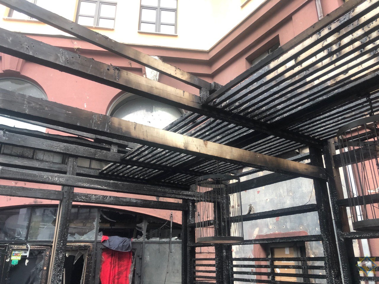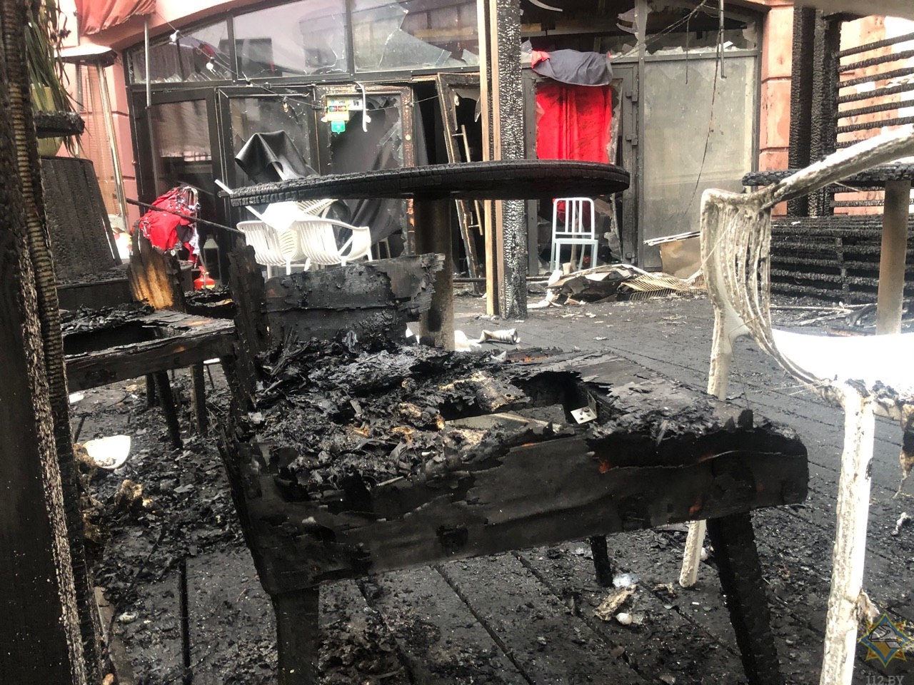 Летняя терраса площадью 20 квадратных метров сгорела. Огонь повредил мебель, оконные блоки, входную дверь бара, остекление заведения. Кроме того повреждено остекление окон пяти этажей лестничного марша торгово-административного центра; входная дверь запасного выхода из служебного помещения магазина обуви, элементы декоративного подвесного потолка служебного помещения; оконный блок, кондиционер, закопчено помещение кухни еще одного бара.